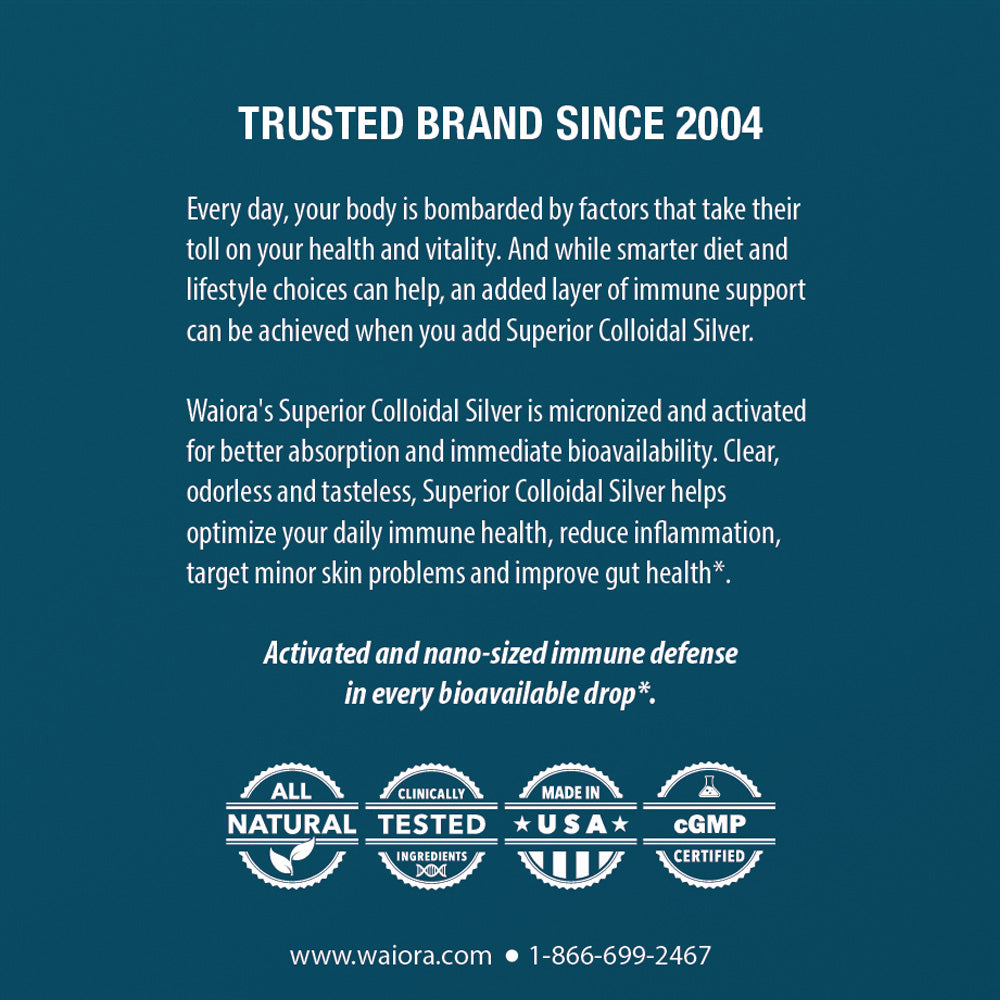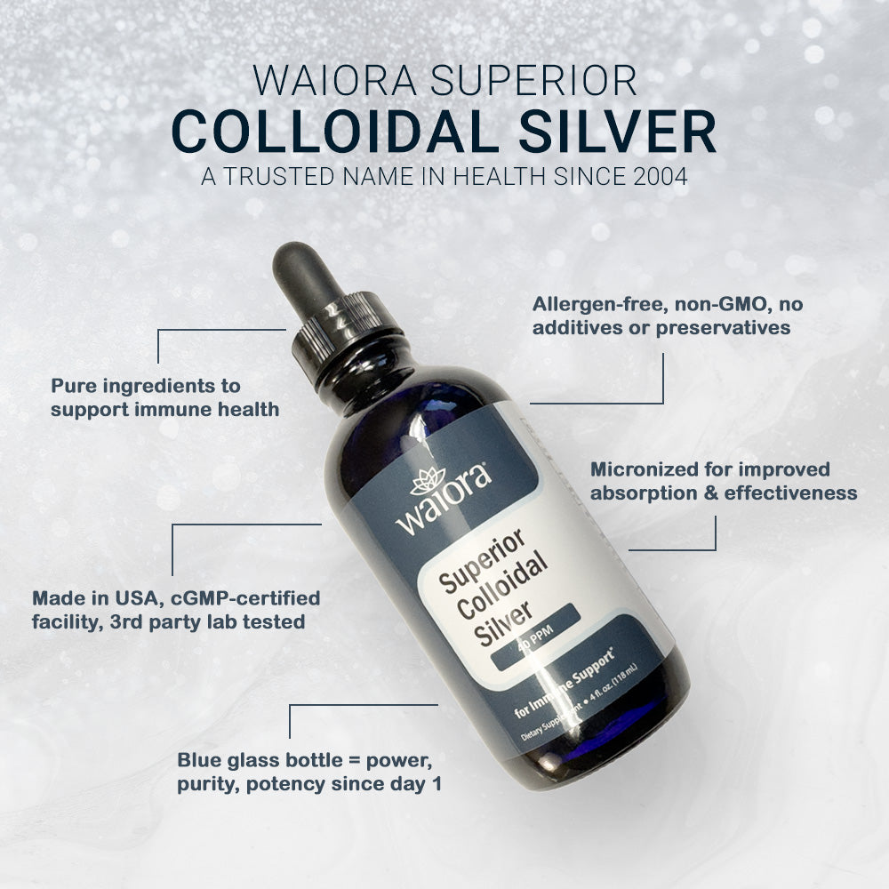 Superior Colloidal Silver is micronized and activated for better absorption and immediate bioavailability. Odorless and tasteless, Superior Colloidal Silver helps optimize your daily immune health, reduce inflammation, target minor skin problems improve gut health and more.*